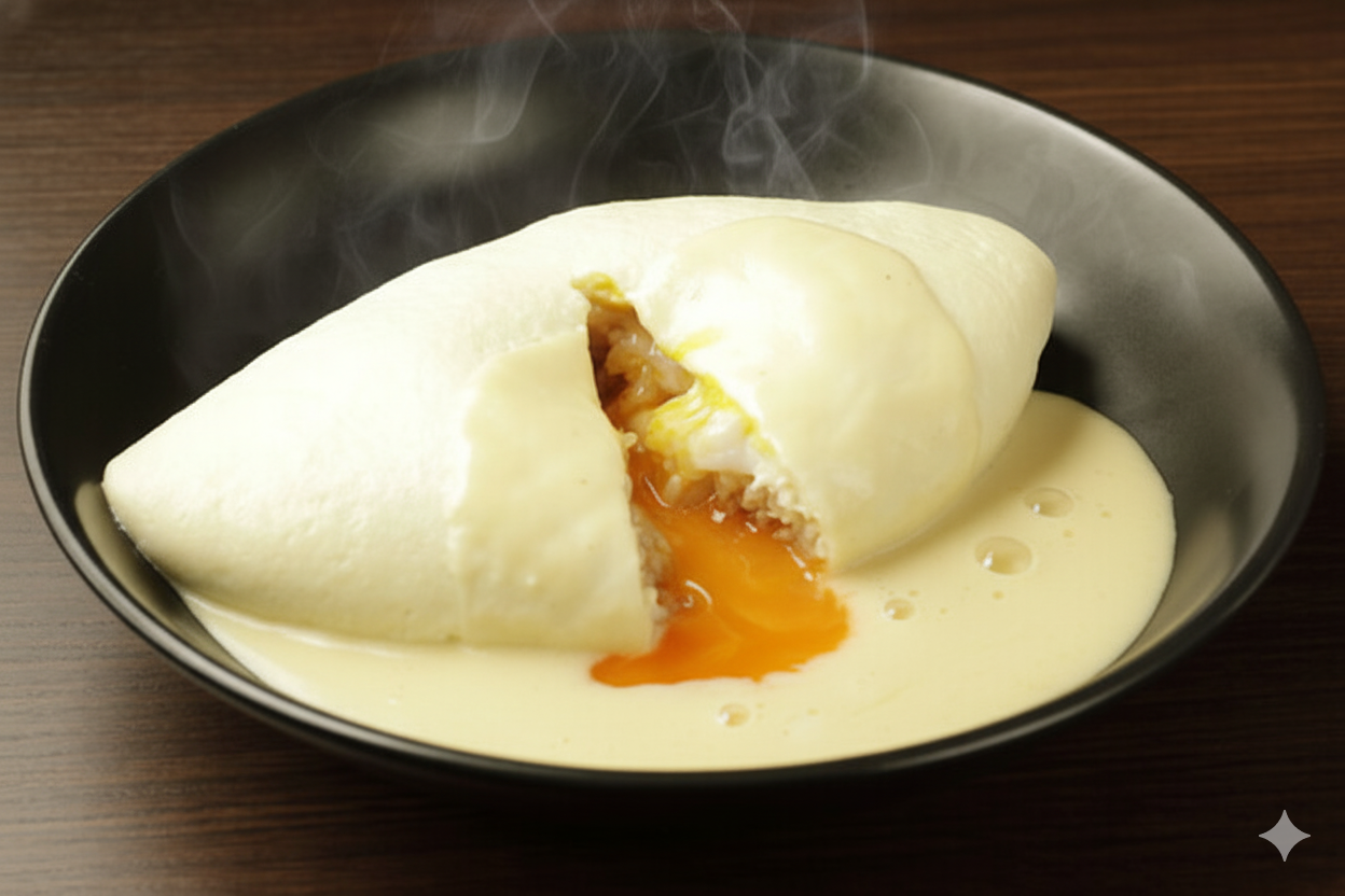 この店の名を一躍有名にしたのが、他ならぬ「白いオムライス」。その名の通り、一分の隙もなく真っ白な一皿は、黒いプレートの上で月のように静謐な光を放ちます。初めて目にする人は皆、そのあまりに完璧な白さに息をのむことでしょう。これは一体、何でできているのか。そんな根源的な問いから、この料理との対話は始まります。
