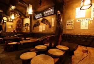 お店は、まさに「知る人ぞ知る」といった趣のある場所にあります。店内はこぢんまりとしており、カウンター席と、奥には低い木製テーブルと丸太の椅子が並ぶ座敷が。